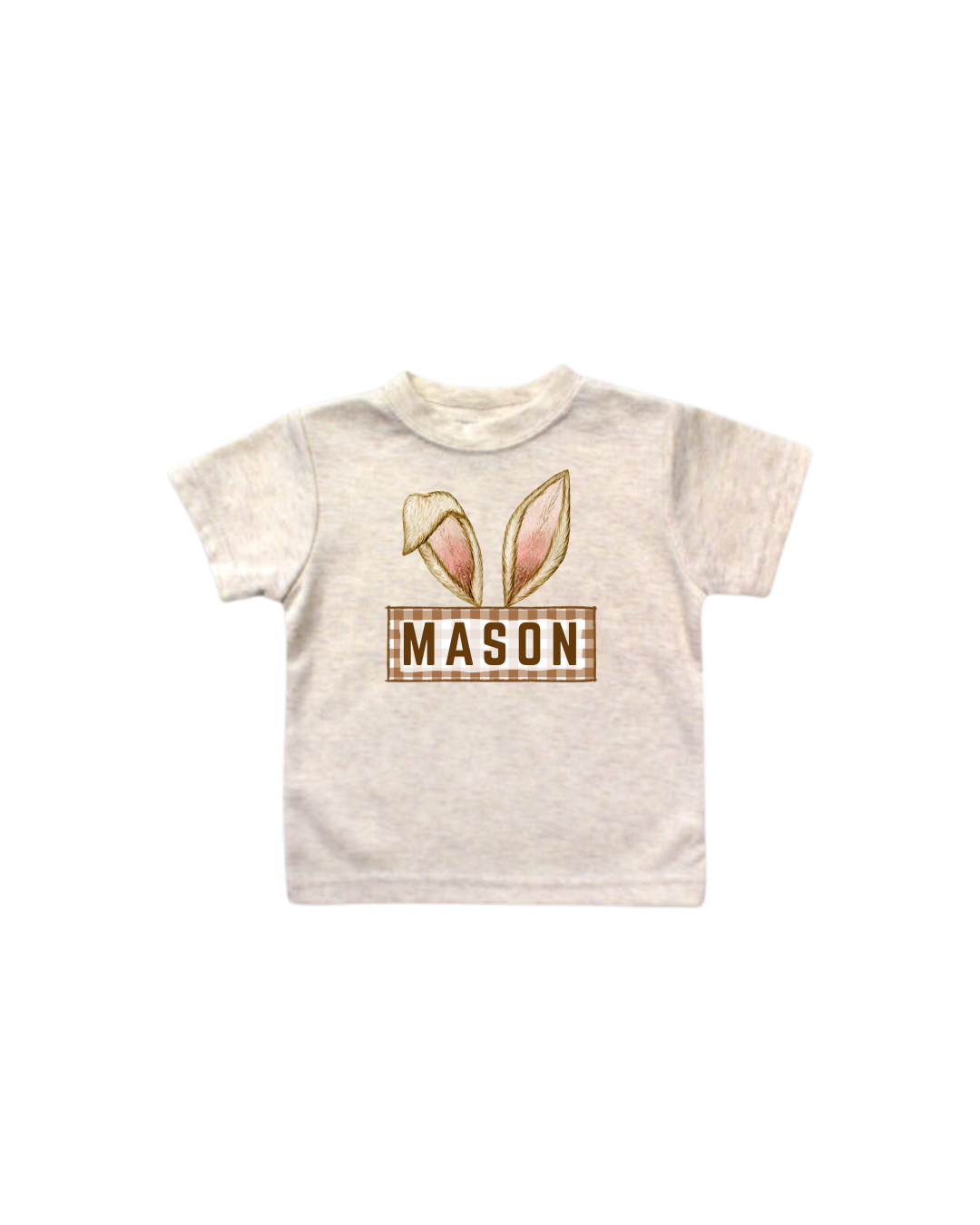 Celebrate Easter in sweet, personalized style with this adorable custom kids shirt! Featuring soft watercolor bunny ears and a charming gingham nameplate, this design is customized with your child’s name for a one-of-a-kind holiday look. The neutral tones and classic pattern make it perfect for Easter egg hunts, spring photos, church, and family gatherings.