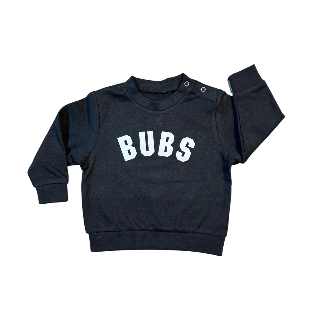 Black crew neck sweatshirt, infant sizes feature shoulder snaps for easy dressing.