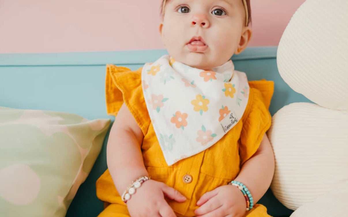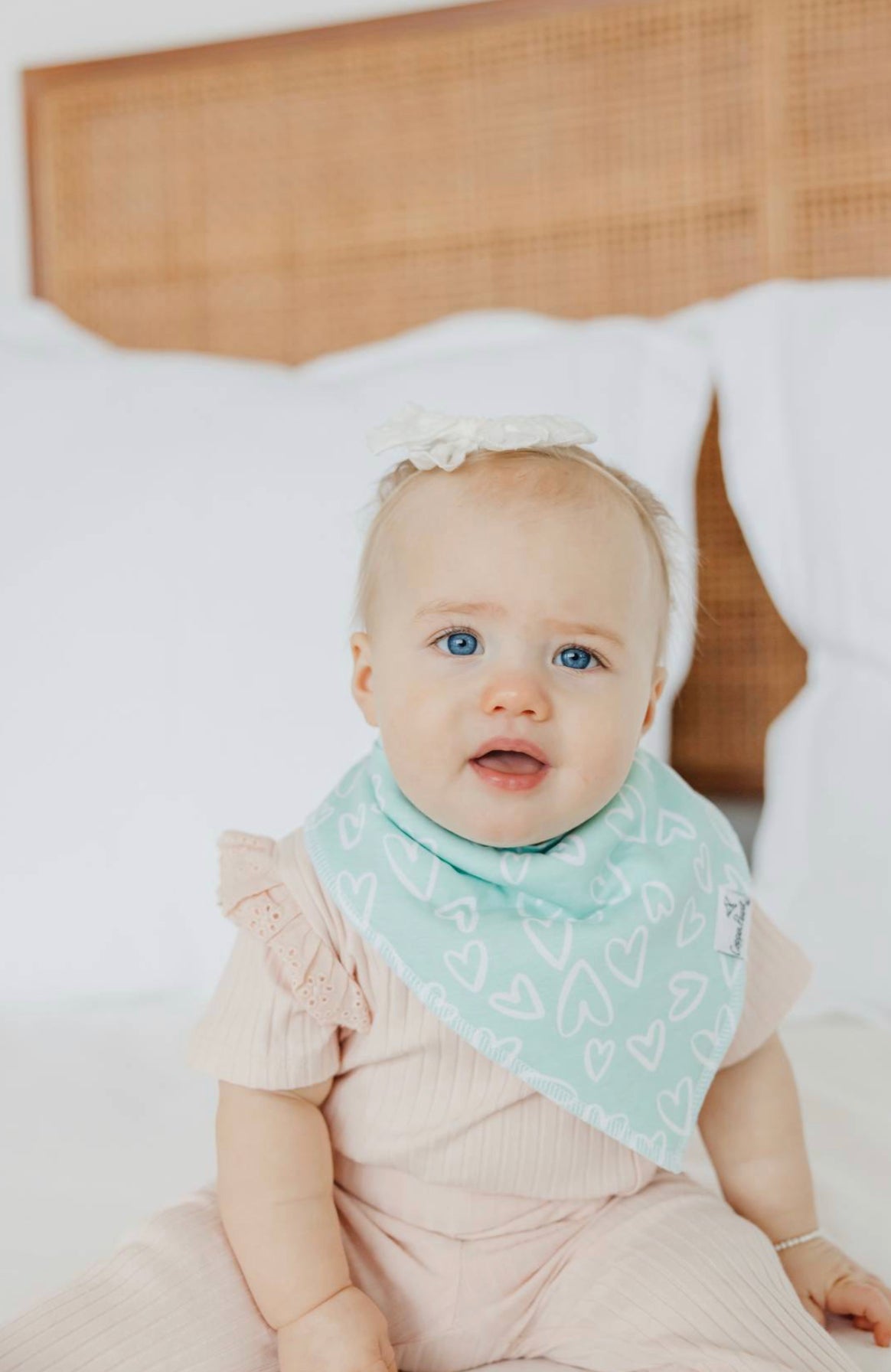 These stylish drool bibs are made of 100% absorbent cotton on the front and 100% polyester fleece on the back. The front of the baby bib is a stylish knit fabric and the back is a super soft fleece that keeps your baby completely dry even with the drooliest of babies. Great for teething babies!