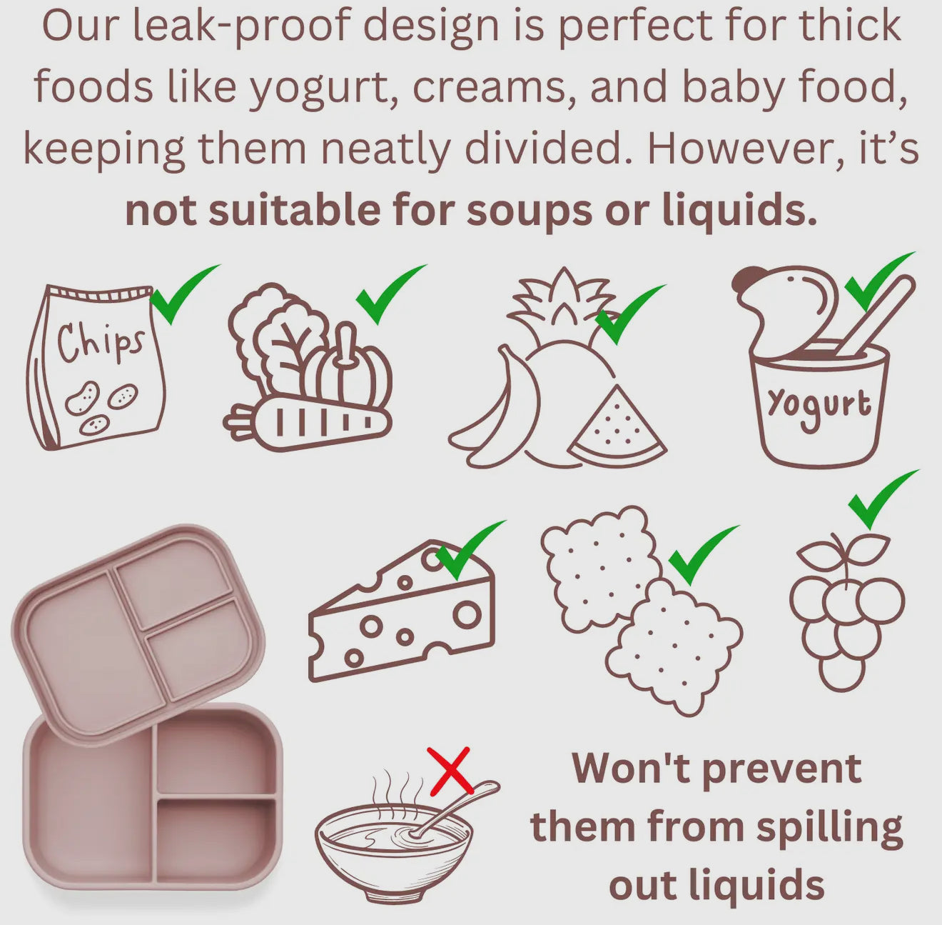 Our leak-proof design is perfect for thick foods like yogurt, creams, and baby food, keeping them neatly divided. However, it’s not suitable for soups or liquids as it won't prevent them from spilling out.