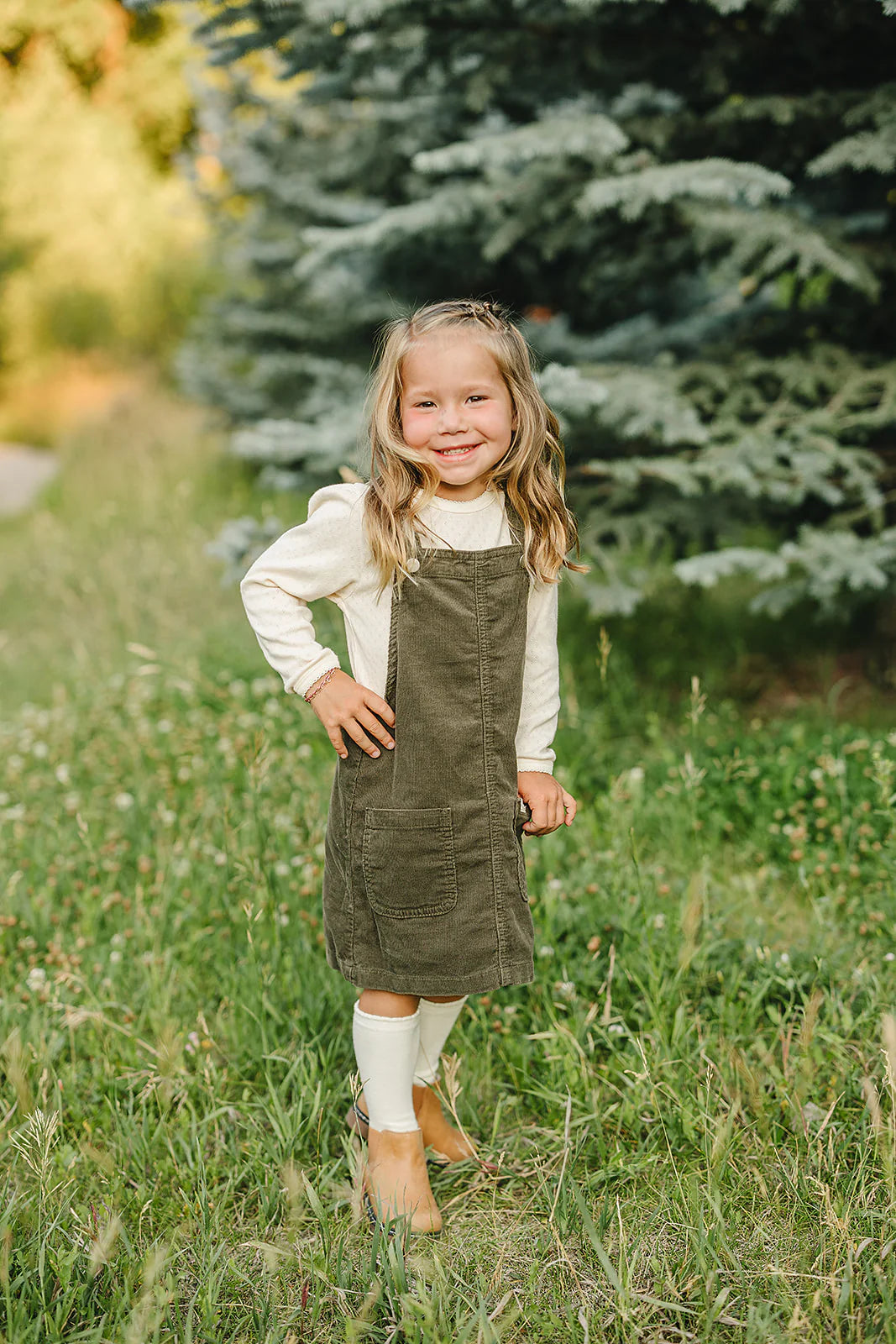 The green hue brings a warm, earthy tone to your child’s wardrobe, while the relaxed fit makes getting dressed simple and fuss-free. Front patch pockets add a playful touch (and a spot for little treasures!), making this dress as practical as it is adorable.