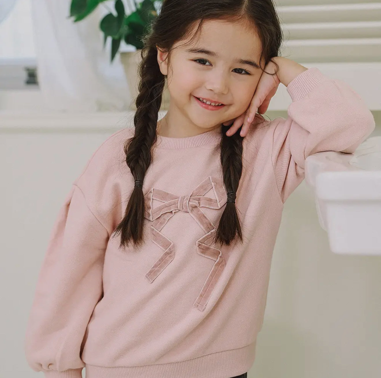 This adorable sweatshirt features puff sleeves for a playful, trendy look, with a charming ribbon detail on the chest that adds a sweet touch of elegance.