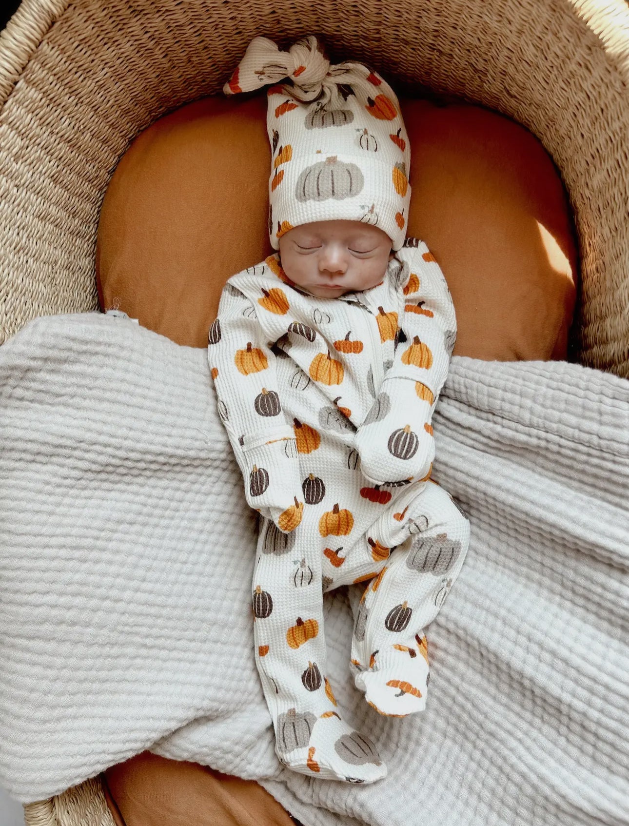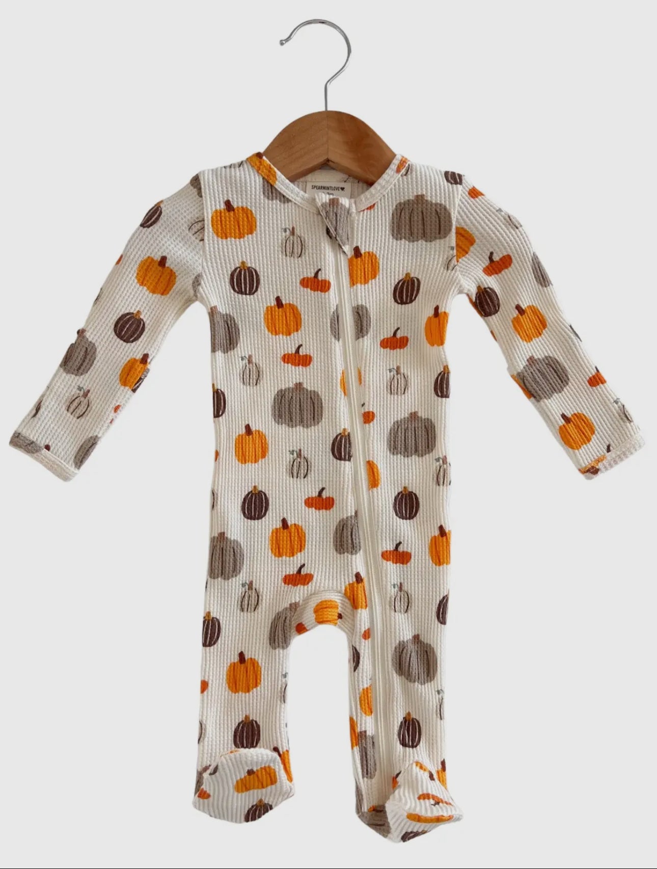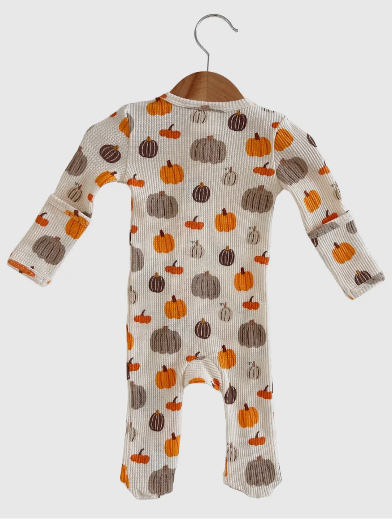 Our signature waffle material with a playful harvest pumpkin print representing the essence of Halloween and fall festivities. Perfect for crisp autumn days, it blends comfort with a seasonal flair, making it a must-have for any fall baby. Whether enjoying pumpkin patches, cozy October nights, or even Thanksgiving gatherings, this outfit adds a festive spirit to every occasion, ensuring stylish looks in tune with the fall season.
